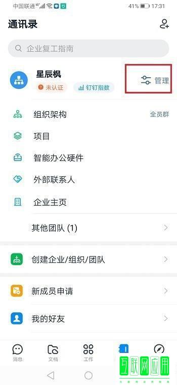 1、1、第一步手机上打开钉钉,进去通讯录,点击管理