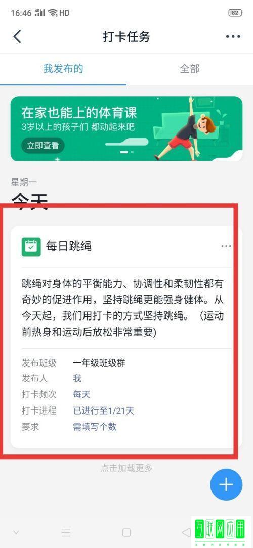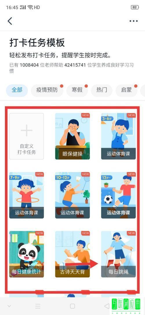 3、点击后,可以选择打卡任务模板,也可以自定义打卡任务,比如选择【每日跳绳】打开任务。