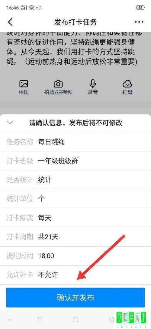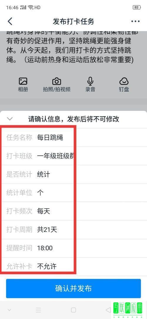 6、核对完信息后,点击【确认并发布】即可,打卡任务就发布完成了。