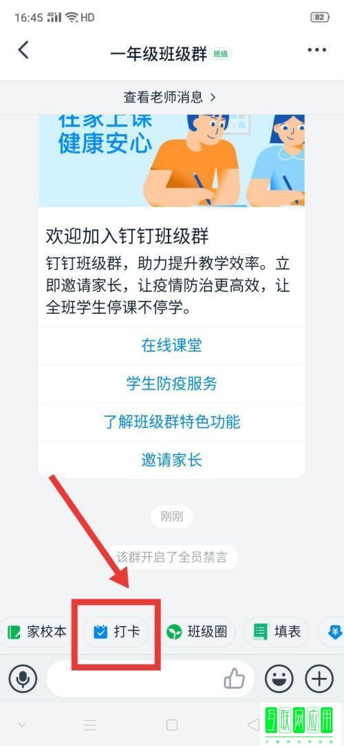 1、打开钉钉,进入班级群,点击右下方的【打卡】。