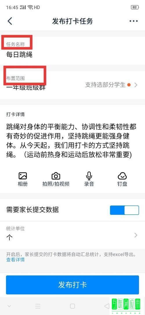 4、选择后,编辑【任务名称】、【布置范围】、【是否允许家长补卡】和【打开周期】等等。