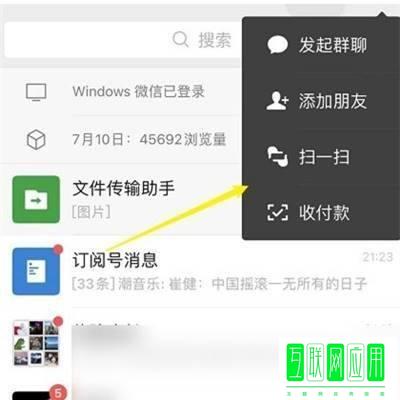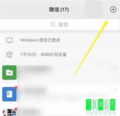 1、打开沃付手机上的微信,点击右耻政歌上角的+号。
