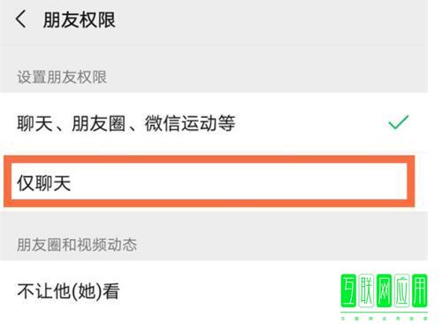 2、最后,在弹出的朋友权限页面里,选择【仅聊天】,点击打开即可设置仅聊天模式。