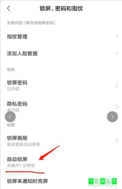 3、打开后,可以看到自动锁屏时间为1分钟,点击打开。