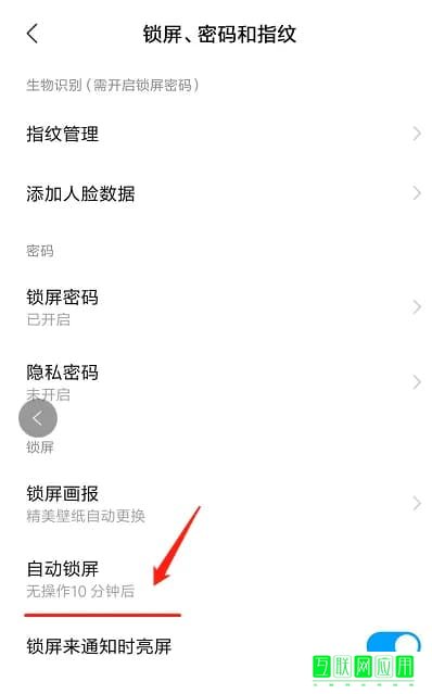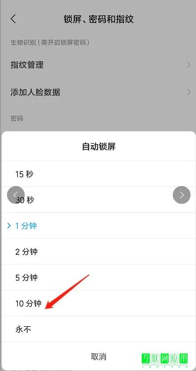 4、打开后,可以自己个性化需要设置锁屏时间为10分钟。